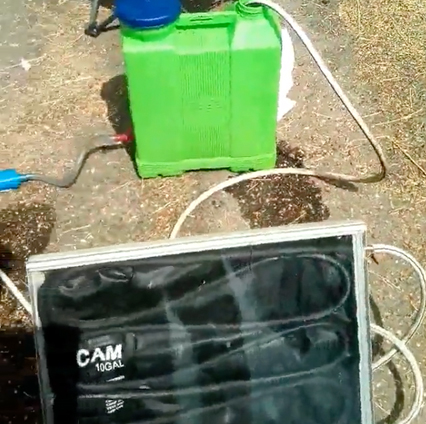 Jean-Charles, 2018, chauffe-eau solaire. Techniques mixtes : porte de réfrigérateur de caravane, plexiglas, réservoir souple de douche solaire, tuyau noir fixé en serpentin.